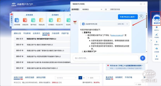 作為鐵建云鏈平臺核心智能化應用創新成果,采購方智能助手采用 “人工智能大模型+專屬知識庫+國產化算力支撐” 的全鏈條技術解決方案。該助手通過深度學習平臺操作手冊、業務規范等核心信息,深度融合物料編碼申請、供應商準入評價、戰略采購協議管理、供需撮合交易等全流程場景專屬知識,已覆蓋1650余條高頻用戶問題。針對采購人員在供應鏈管理全流程、多場景中的業務咨詢,其常見問題識別準確率超 90%,響應速度最快達5秒;同時支持用戶自主選擇關聯歷史對話,強化大模型邏輯推理與上下文理解能力,顯著提升采購業務辦理便捷度與運營效率。